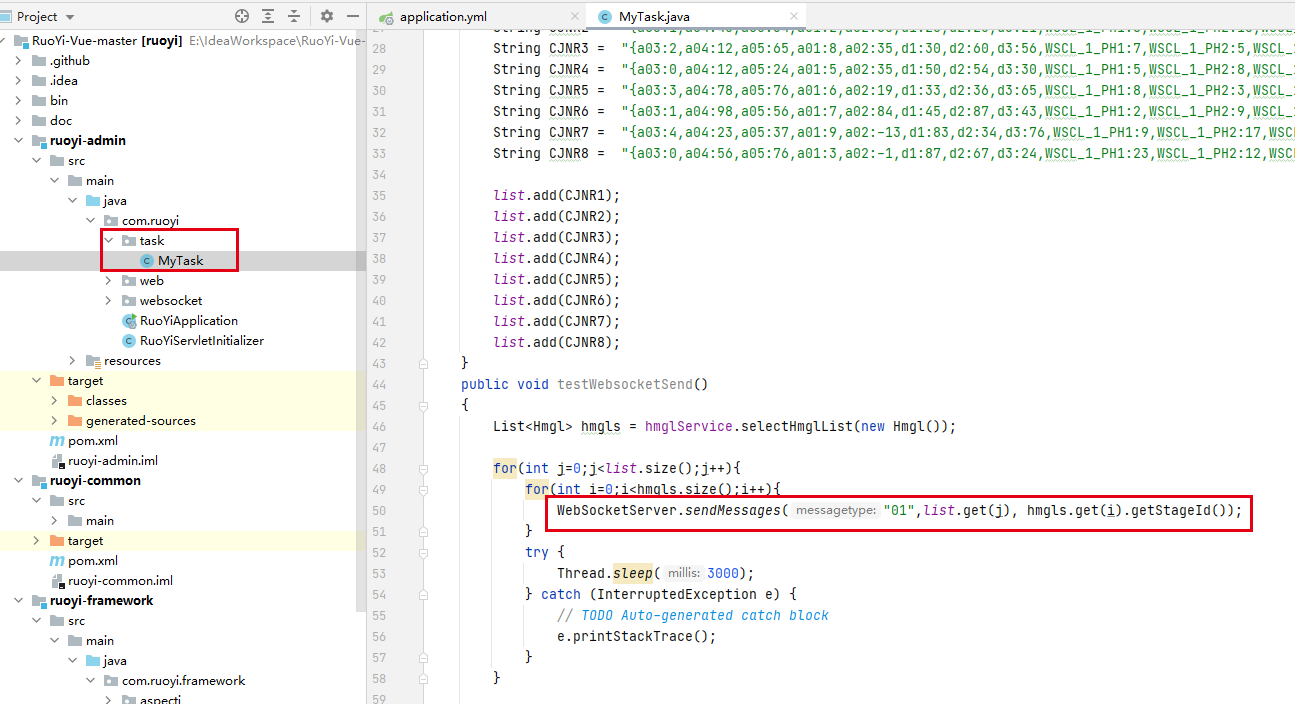 由于我们是前端插件,后台仅仅是测试例子,并没有真正接入设备,所以在若依的项目中做了一个定时任务,往前端推送数据。